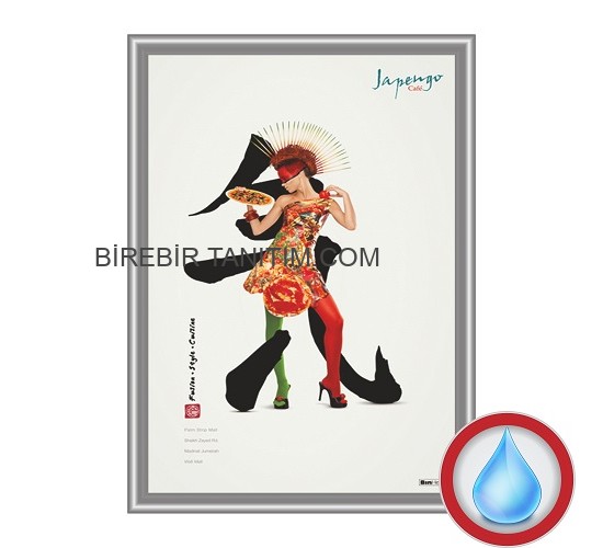Su Geçirmez Afiş Çerçevesi, seçtiğiniz grafiğin sergilenmesi için profesyonel bir çözümdür. Su Geçirmez mekanik sistemin yanı sıra, çerçeve dizaynı kaliteli ve dikkat çekici estetiğe sahiptir. Kullanılan materyal ve şekli dolayısıyla her türlü ortama uyum sağlar. Görselleriniz özel koruma filmi sayesinde ışığa bağlı parlama yapmaz ve solmaz.
